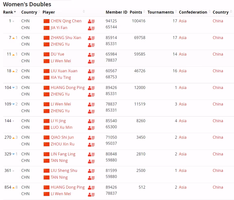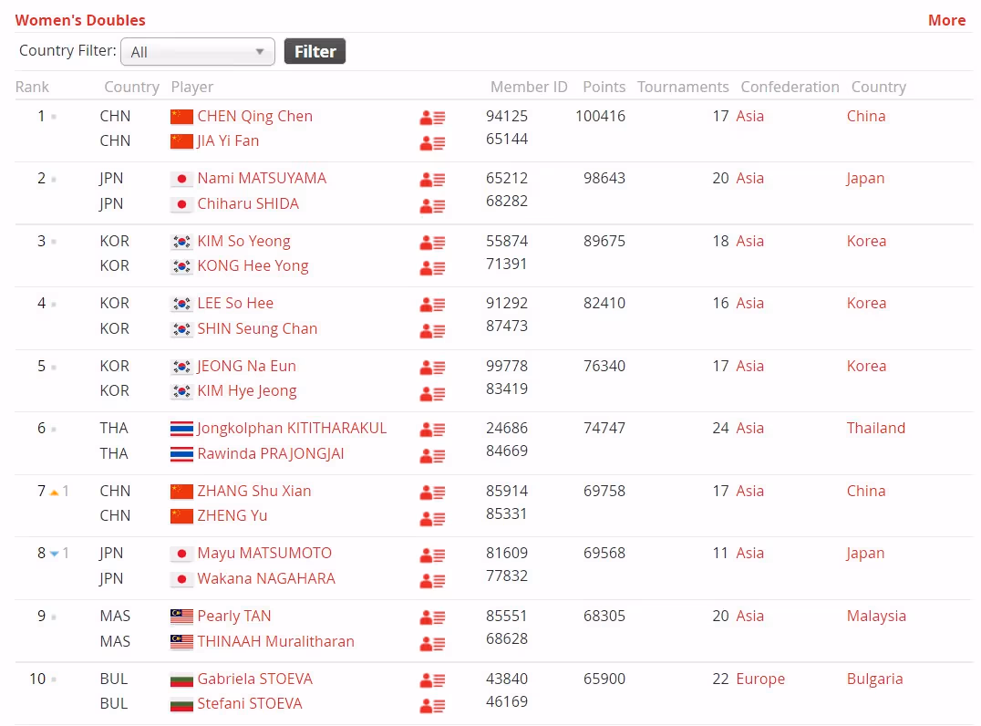女双世界排名前10中,张殊贤/郑雨上升1位至第7,松本麻佑/永原和可那下降1位至第8,其他并无变化。