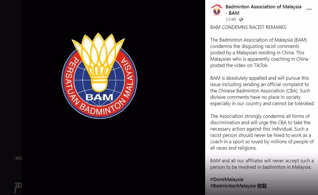 “这样的种族主义者应该永远不被一项受到各种族和宗教信仰的数百万人喜爱的运动聘请担任教练。大马羽总和我们所有的属会绝对不会接受这样的人,参与到马来西亚羽球运动中。”