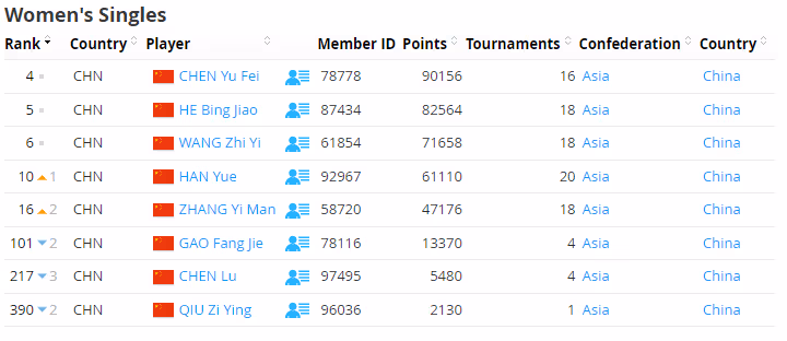 国羽女单方面,陈雨菲第4、何冰娇第5、王祉怡第6,高昉洁下降2位至第101、陈鲁下降3位至第217。