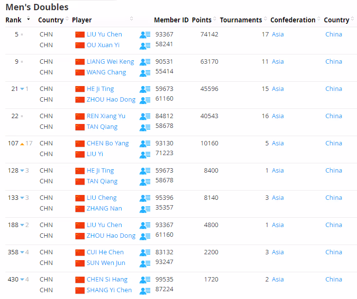 男双世界排名前10中,连续两站赛事背靠背夺冠的印尼组合卡尔南多/马丁上升3位闯进前10,其他并无变化。