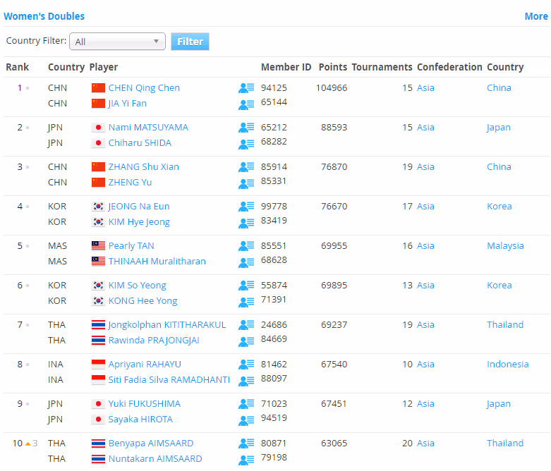 女双世界排名前10中,在主场泰国大师赛夺得冠军的本雅帕/努塔卡伦上升3位至第10,其他并无变化。