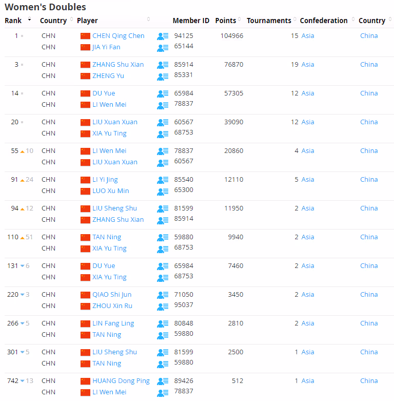 国羽女双方面,陈清晨/贾一凡第1、张殊贤/郑雨第3、杜玥/李汶妹第14、刘玄炫/夏玉婷第20,李汶妹/刘玄炫上升10位至第55,李怡婧/罗徐敏上升24位至第91、刘圣书/张殊贤上升12位第94、谭宁/夏玉婷上升51位至第110,杜玥/夏玉婷下降6位至第131、刘圣书/谭宁下降5位至第301。