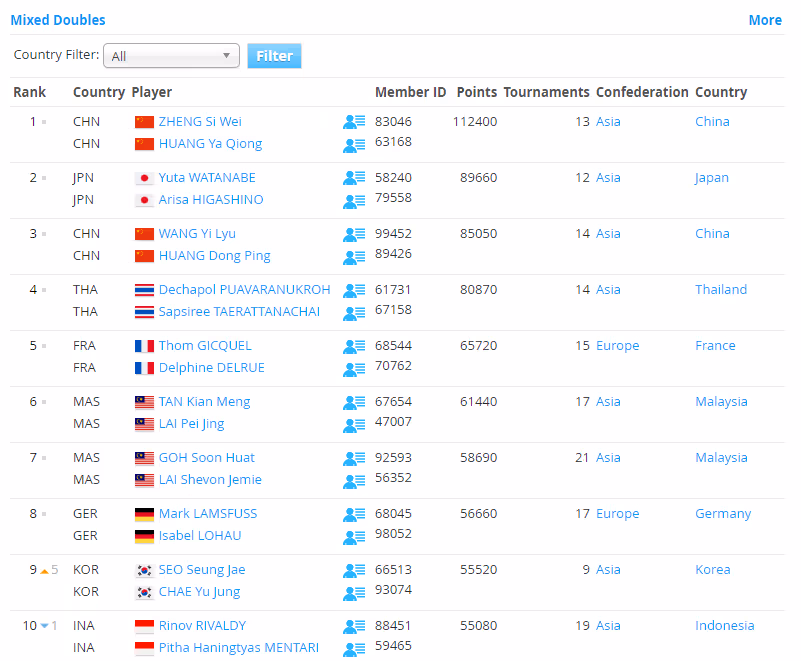混双世界排名前10中,夺得泰国大师赛亚军的徐承宰/蔡侑玎上升5位至第9,里瓦尔迪/皮塔下降1位至第10,其他并无变化。
