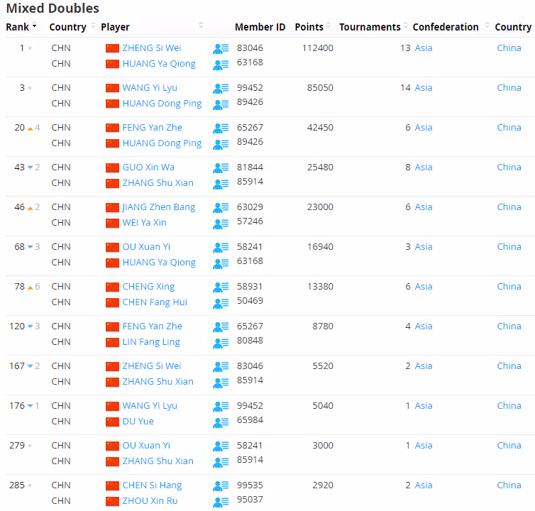 国羽混双方面,郑思维/黄雅琼第1、王懿律/黄东萍第3,冯彦哲/黄东萍上升4位至第20,郭新娃/张殊贤下降2位至第43,蒋振邦/魏雅欣上升2位至第46、程星/陈芳卉上升6位至第78,冯彦哲/林芳灵下降3位至第120,王懿律/杜玥下降1位至第176。