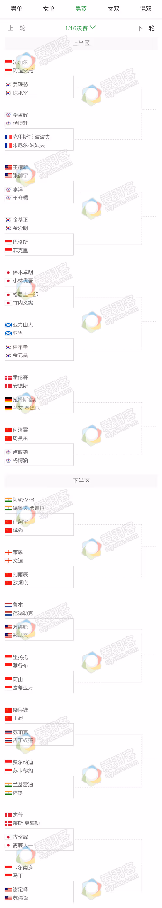 镇守在上半区的印尼双阿组合首轮对阵姜敏赫/徐承宰,次轮或遇上法国组合波波夫兄弟;同在一个1/4半区的8号种子王耀新/张御宇首轮对阵李洋/王齐麟。独在上半区的何济霆/周昊东首轮对阵卢敬尧/杨博涵。