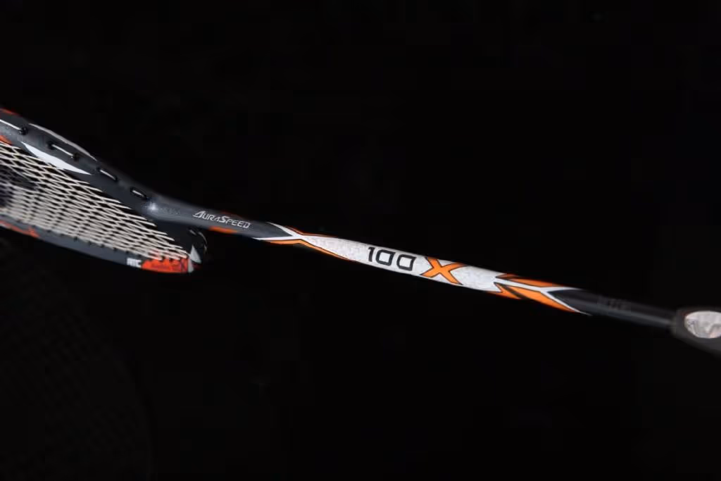 神速100X是一款着重操控的速度型球拍,平衡点含底胶大约为298mm,中杆偏硬,在头重感和挥重方面比龙牙之刃略低,较为容易上手,最大亮点可能就是透明设计的拍锥和人造手柄了,虽然定位速度型,但在印尼老将阿山手中,一样是大杀器。