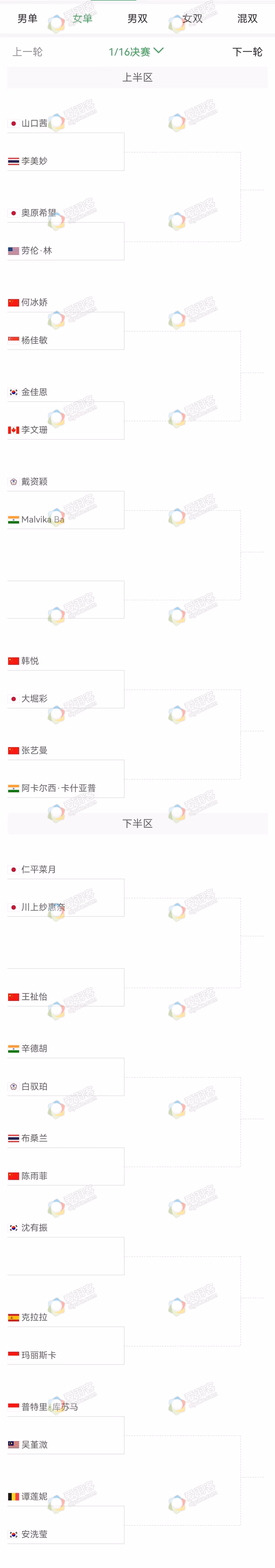 何冰娇是赛会5号种子,首轮对阵杨佳敏,成功晋级至八强就会遇到头号种子山口茜,同在上半区的7号种子韩悦首轮迎战大堀彩,次轮或内战张艺曼。