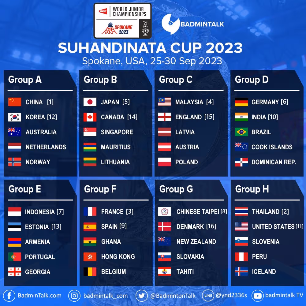 2023年8月9日,世界青年混合团体锦标赛暨苏汉迪纳塔杯抽签出炉,将于9月25日至30日在美国斯波坎举行。