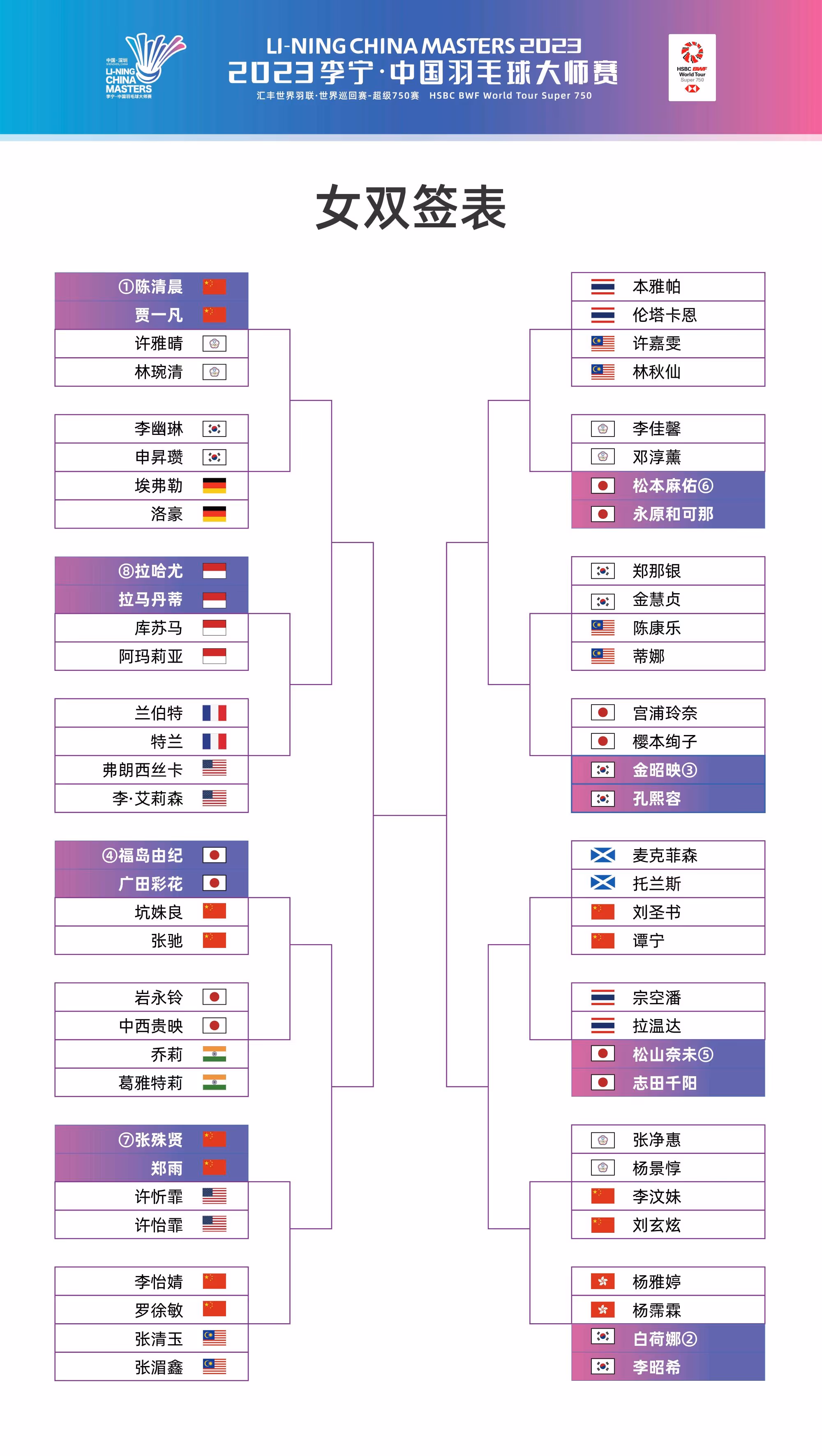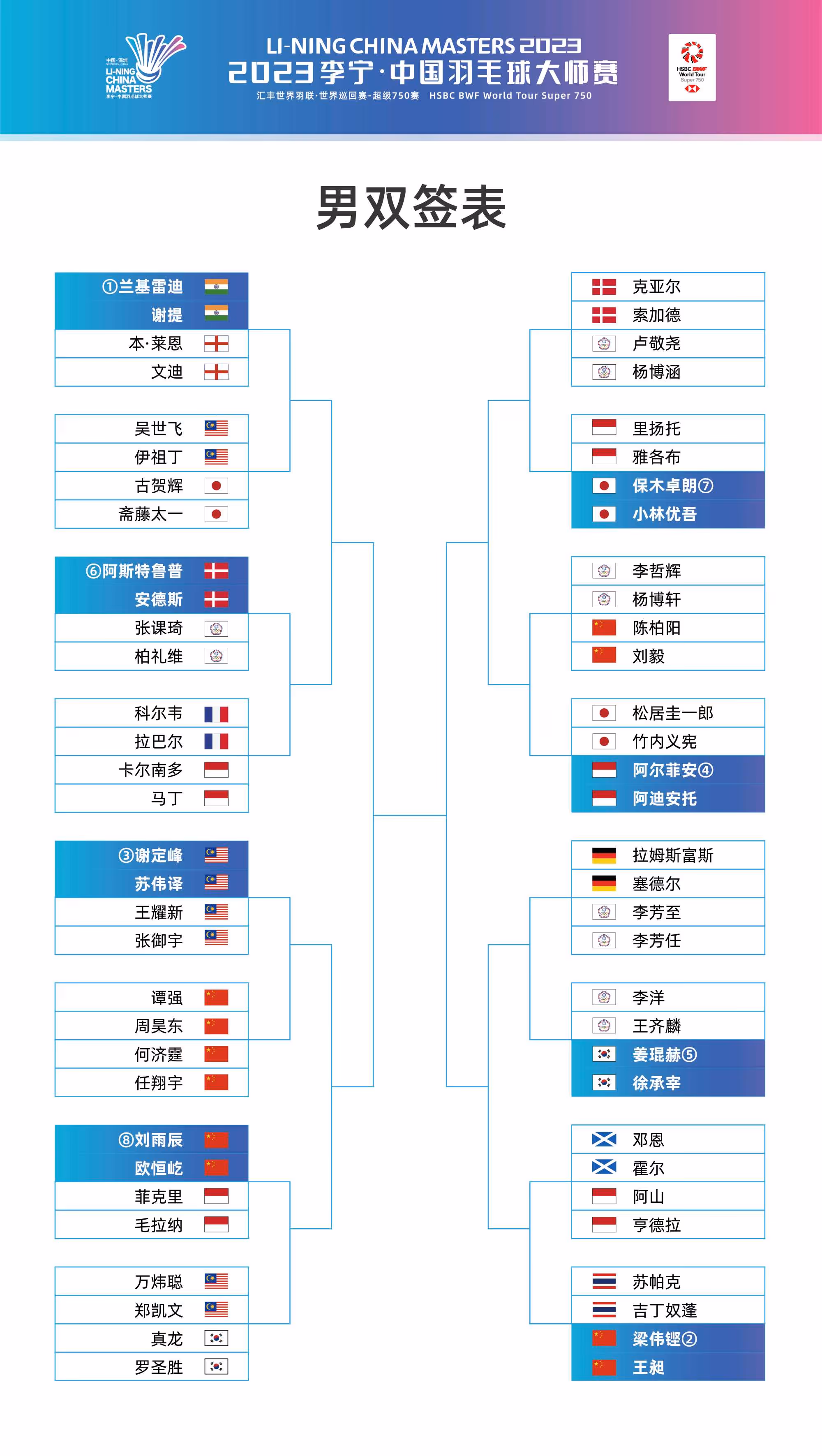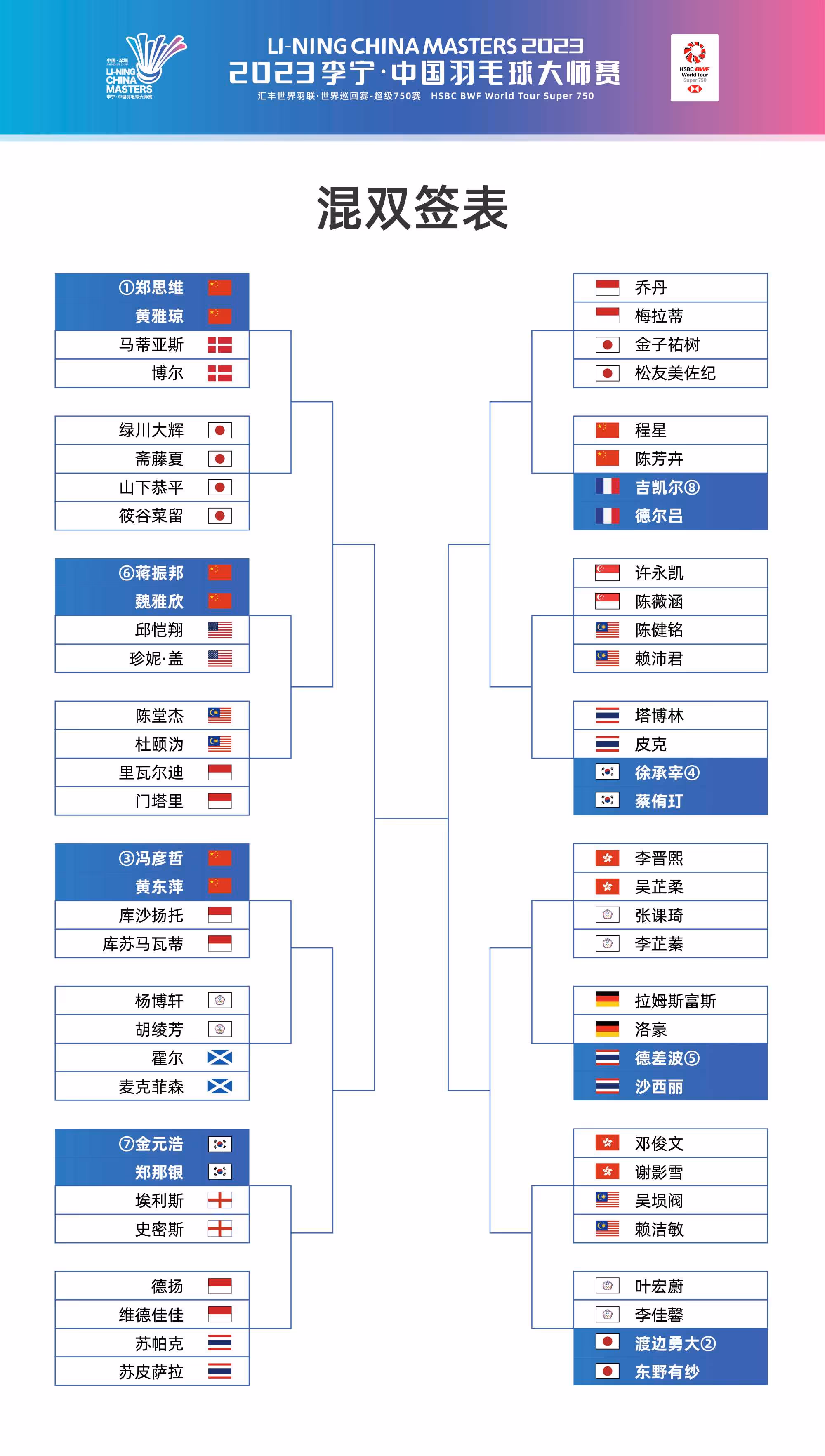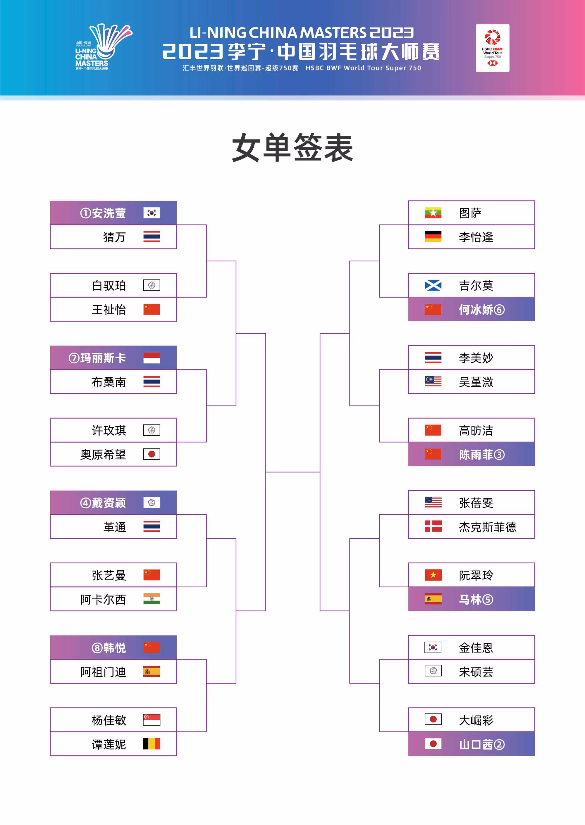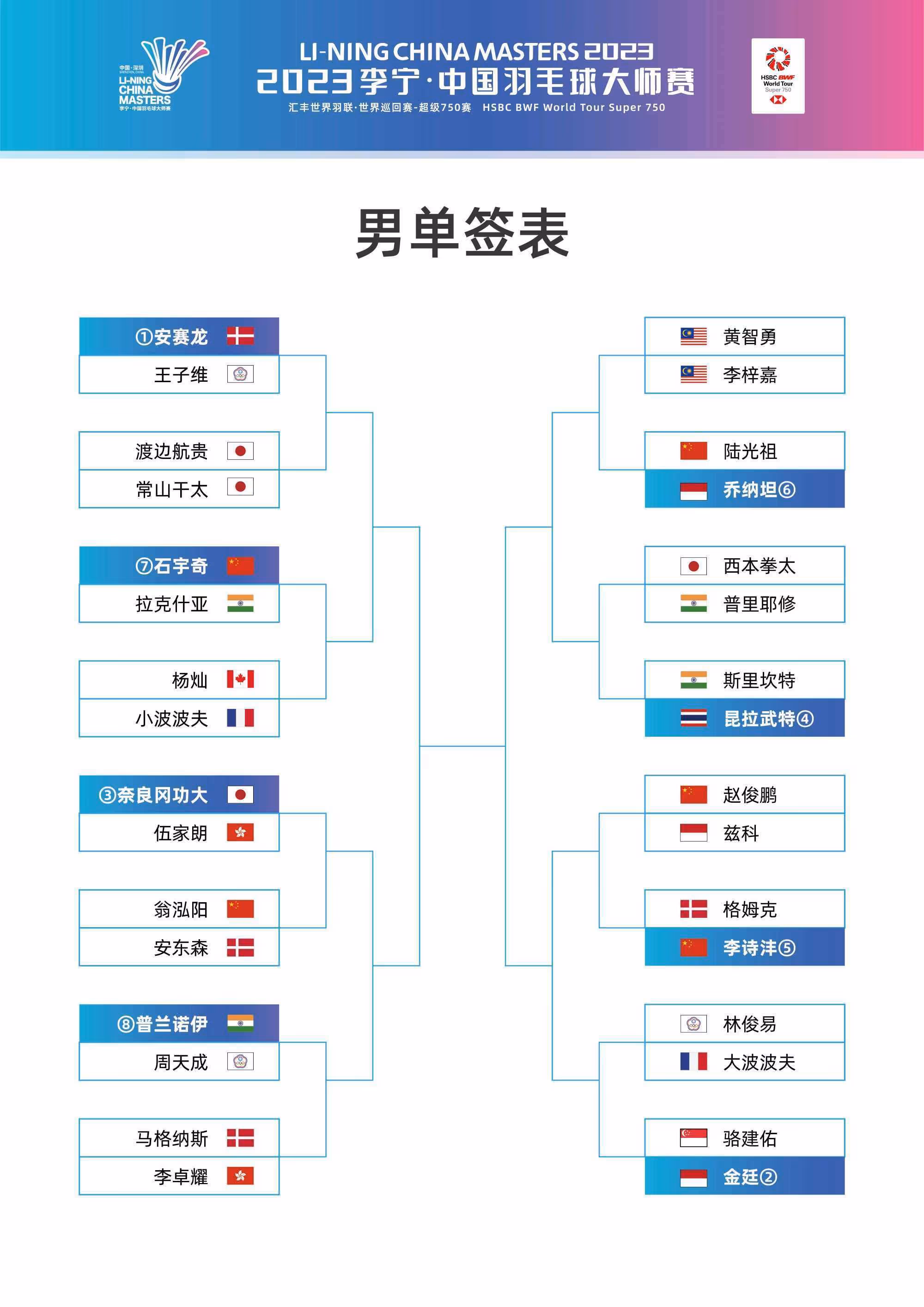 2023中国羽毛球大师赛签表出炉,比赛将于11月21日-26日深圳湾体育中心体育馆举行,总奖金100万美元,该项比赛属于世界羽联巡回赛“超级750赛”,将连续4年在深圳举办。